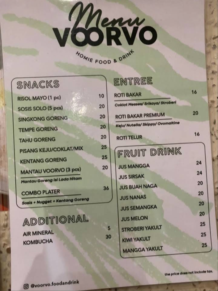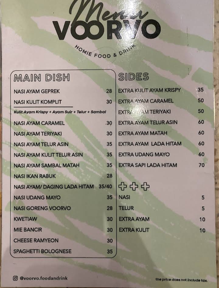Dibandrol dari harga di bawah Rp. 100.000, kamu bisa menikmati kopi ditambah makanan berat pilihan! Lagi gak mood makan, tapi mood ngemil? Bisa juga dong! Voorvo Food and Drink menawarkan banyak cemilan cemilan juga, kok! Walau harga lumayan pricey kualitas makanan di cafe ini terjamin banget dengan atmosfernya yang welcoming banget!