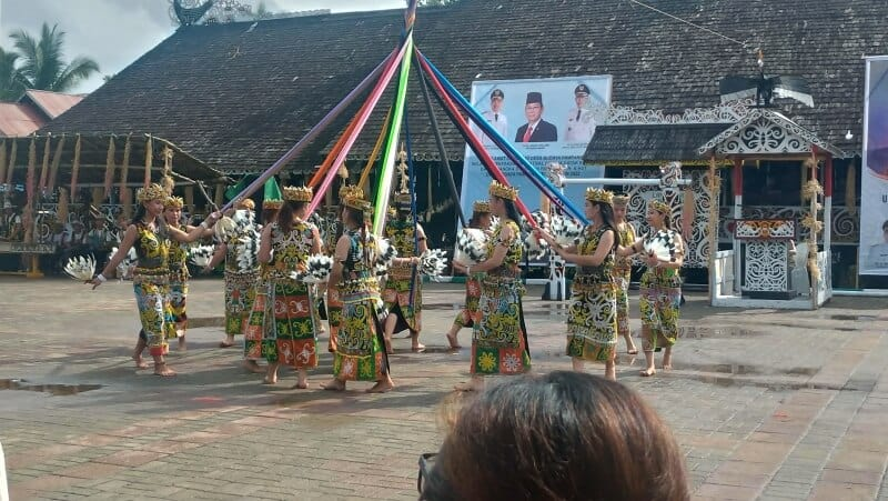 Tak hanya menonton, pengunjung juga bisa ikut menari, mencoba pakaian adat, atau berfoto dengan latar rumah panjang yang artistik.